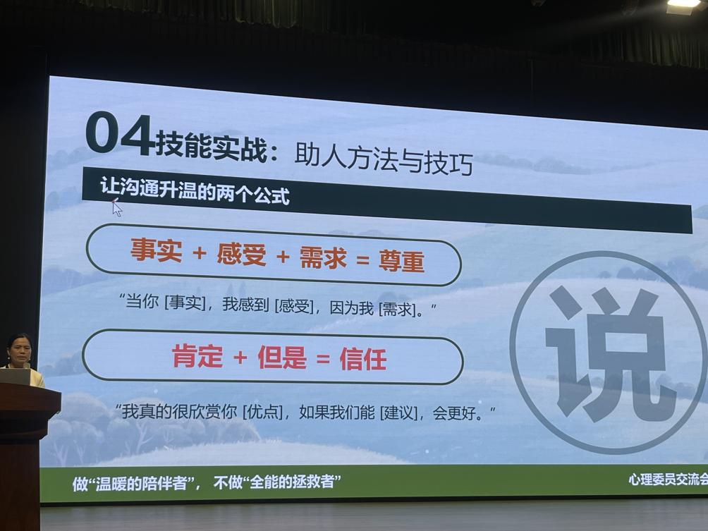 25高助班心理委员胡嘉怡分享道,“这次培训让我明白陪伴者的定位,不再担心帮不上忙或越界,倾听法和沟通公式实用性强,让我知道如何科学回应同学的困扰及正确的沟通方式。”