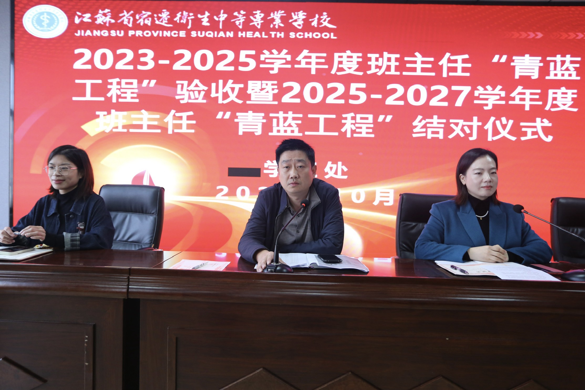 为发挥骨干引领作用,加速青年班主任成长,共筑德才兼备的班主任团队,10月31日下午,宿迁卫校举行了2023-2025学年班主任“青蓝工程”验收暨2025-2027学年班主任 “青蓝工程”结对仪式。校党委委员、副校长荣峰、学工处副处长杨阳、宋彦羿、蔡微,各系部学工主任,结题师徒及新结对师徒参加了本次活动,仪式由杨阳主持。