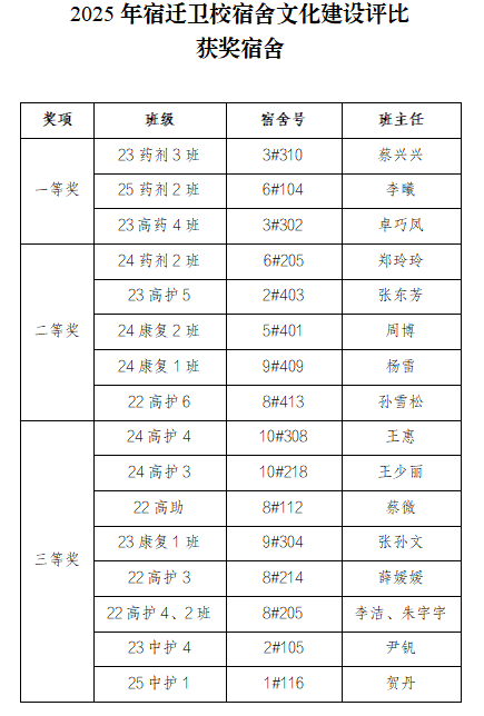 宿迁卫校始终重视环境育人、文化育人,通过开展形式多样的文化建设活动,不断丰富校园文化内涵,提升学生综合素养。此次宿舍文化评比,是继班级文化建设活动后的又一重要举措,期待同学们在活动中展现智慧、共建文明,让每一间宿舍都成为校园中温暖而明亮的美好角落。(一审:宋彦羿;二审:杨阳;三审:荣峰)
