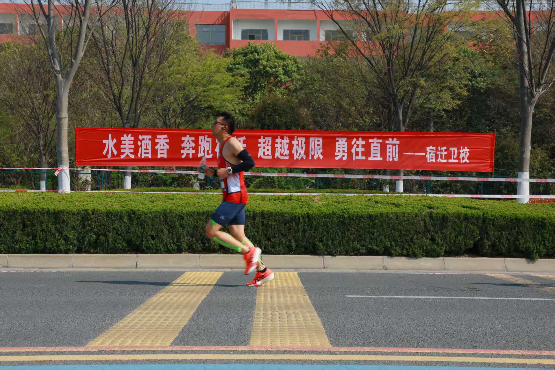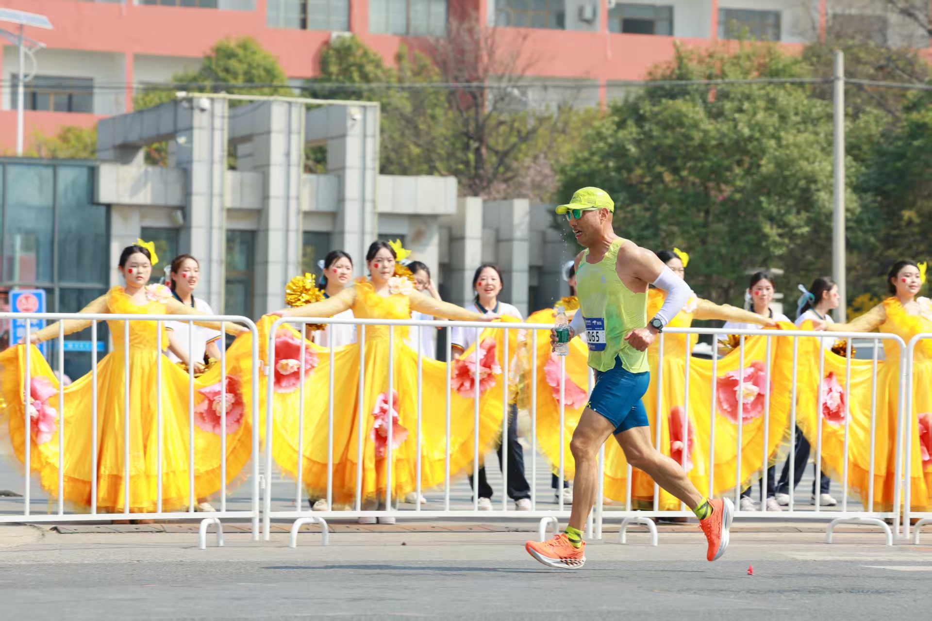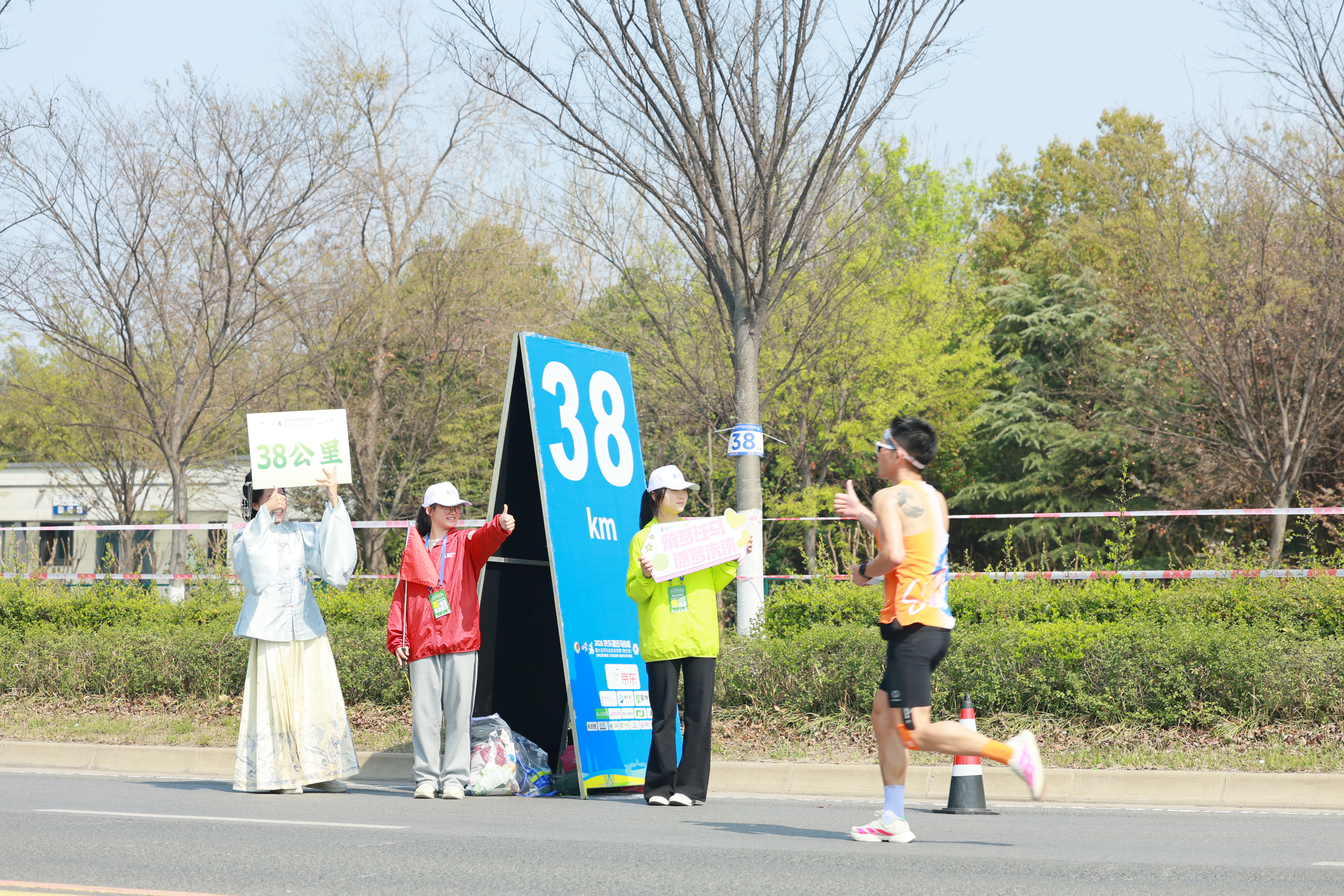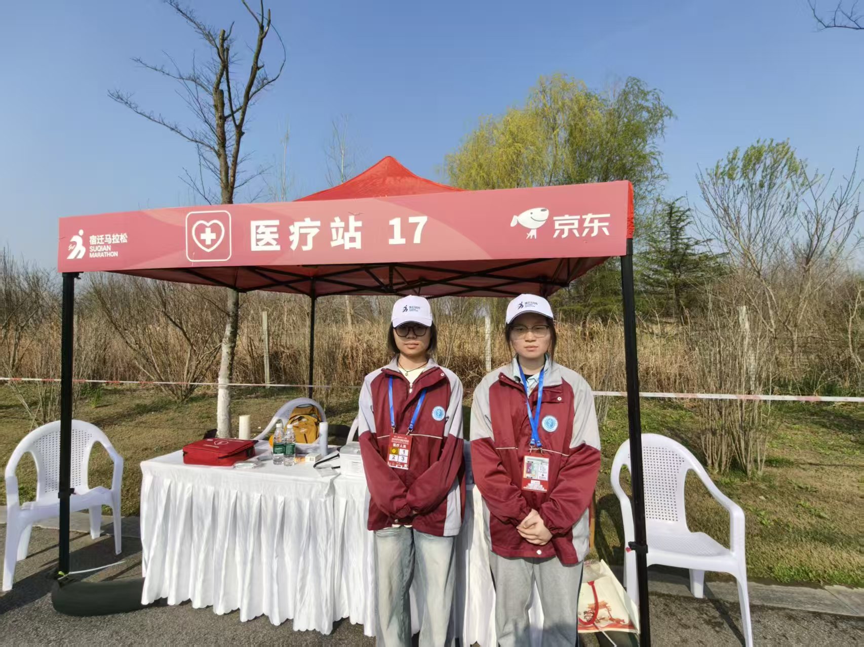赛事进行期间,志愿者们清晨4时40分完成集结,5时30分便奔赴各岗位,分区域值守于赛道沿线关键节点,职责分工明确。480名赛道观察员以平均每百米一人的密度布设于全程赛道,实时关注选手状态,发现倒地或异常情况立即上报并协助处置,维护现场秩序;16名医疗小助手驻守固定医疗站点,配合医护人员完成伤口处理、物资保障等紧急救护工作;110名啦啦队队员以整齐有力的动作和热情响亮的口号,持续为跑者加油鼓劲。多名带队教师现场组织协调,保障各环节衔接顺畅。宿迁卫校志愿者们以真诚的态度和细致的服务,为赛事增添了温暖底色,生动诠释了“奉献、友爱、互助、进步”的志愿精神。