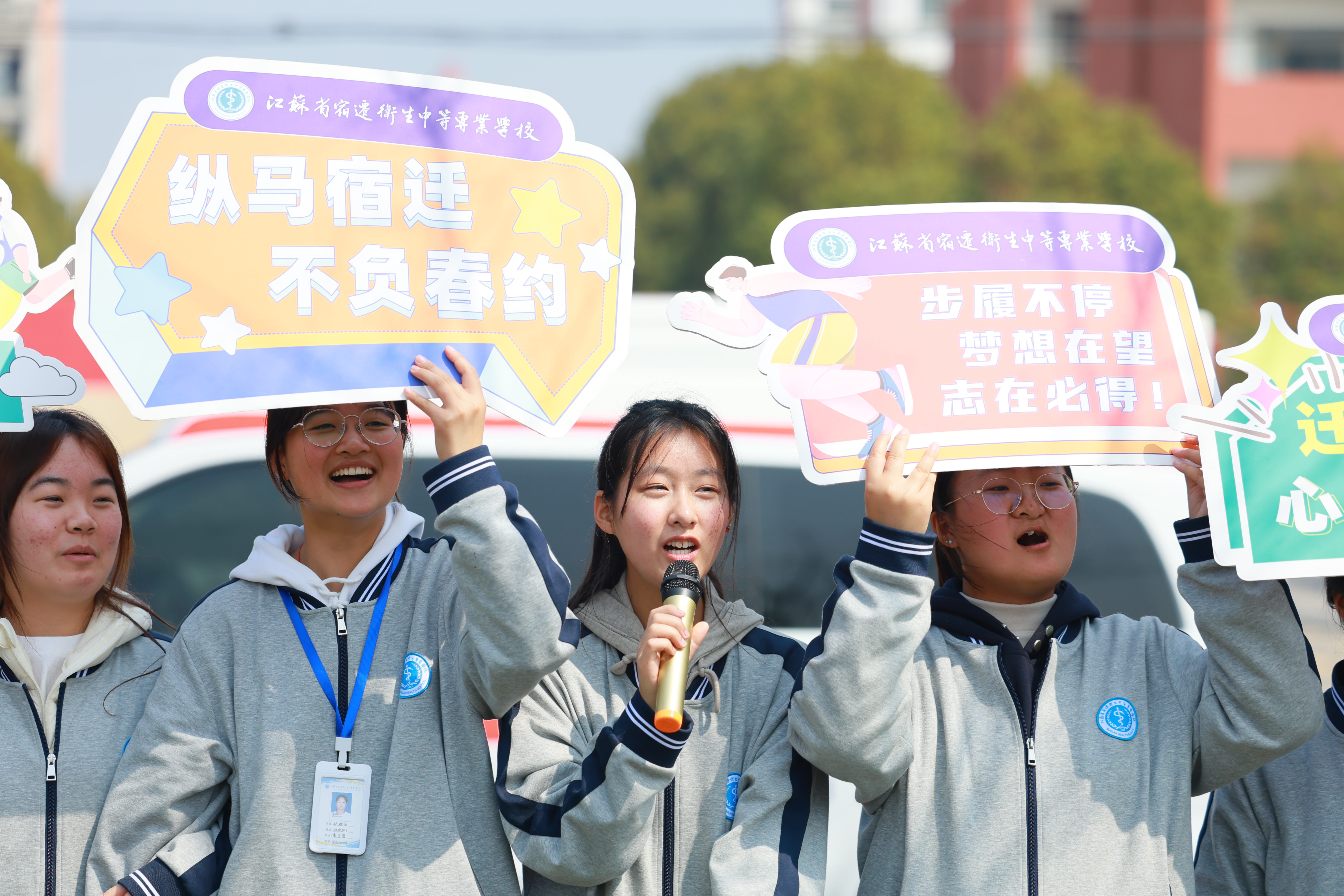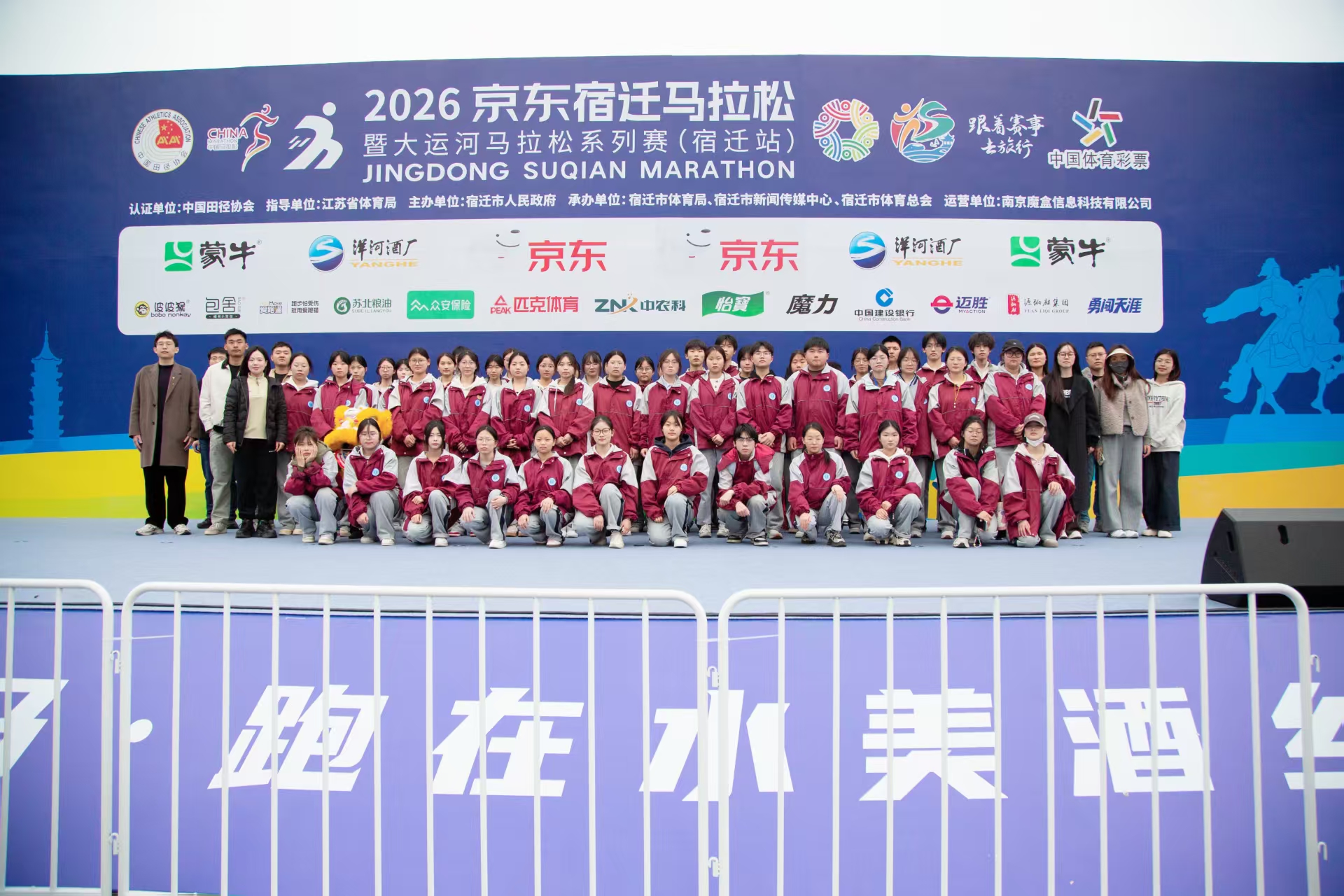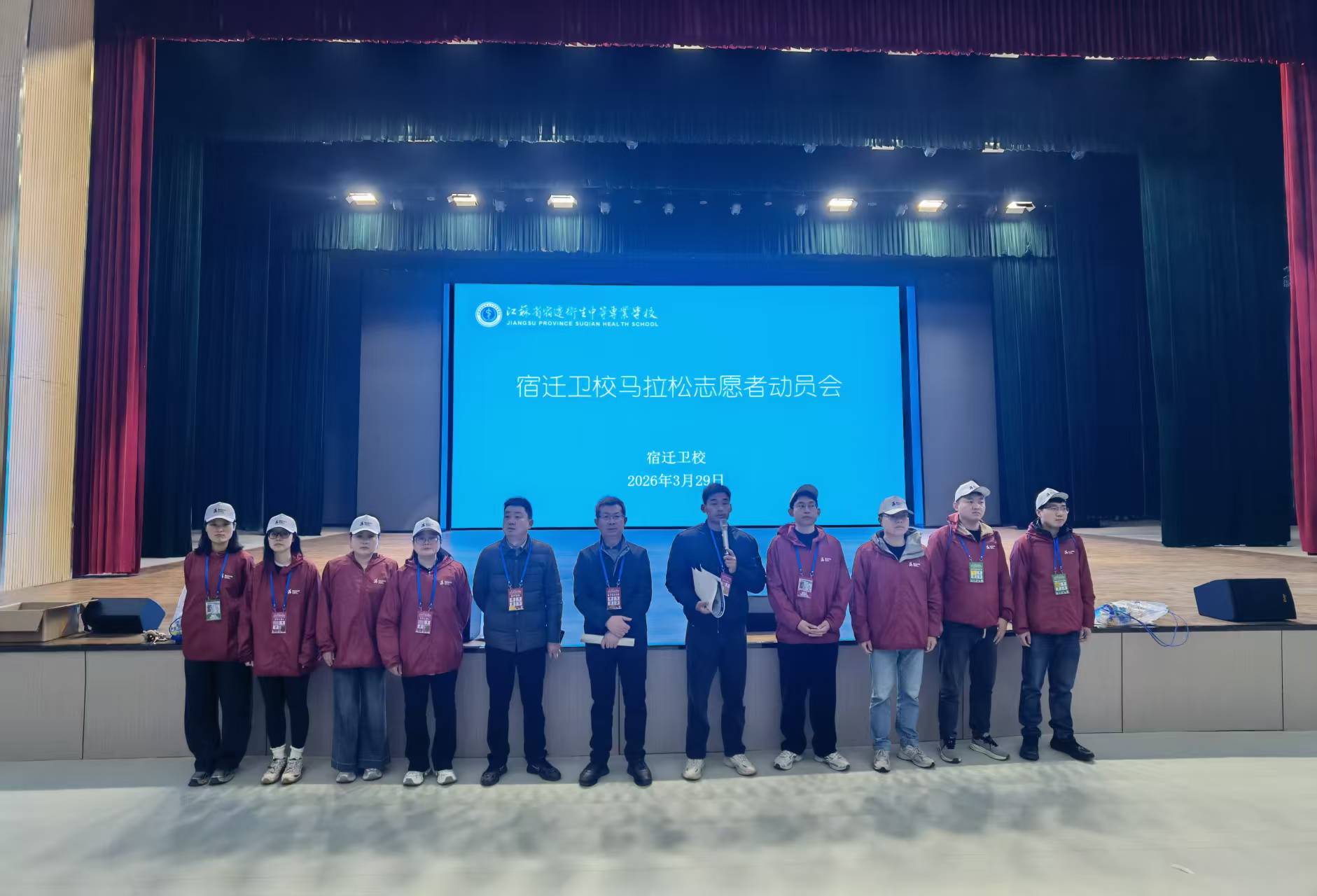3月29日上午7时30分,2026京东宿迁马拉松暨大运河马拉松系列赛(宿迁站)在项王故里景区鸣枪开跑。来自全国各地的万余名跑者齐聚宿迁,在仲春的晨光中奔赴梦想。宿迁卫校共组织近500名学生志愿者参与赛事医疗保障工作,另有100余名志愿者承担啦啦队氛围营造任务,凭借扎实的专业能力和昂扬的青春风貌,为赛事安全运行提供有力支撑。
